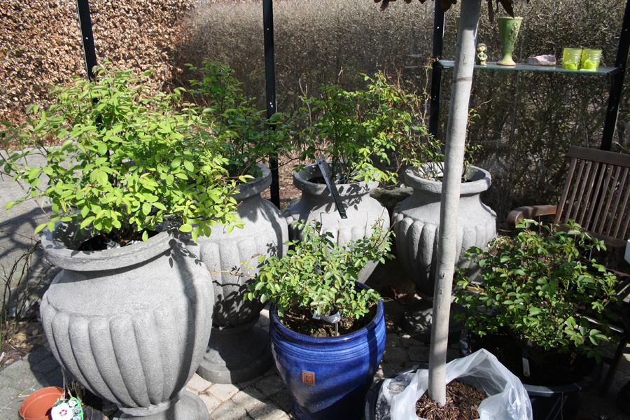 6 flotte krukker fyldt med roser der kommer til at dufte så dejligt